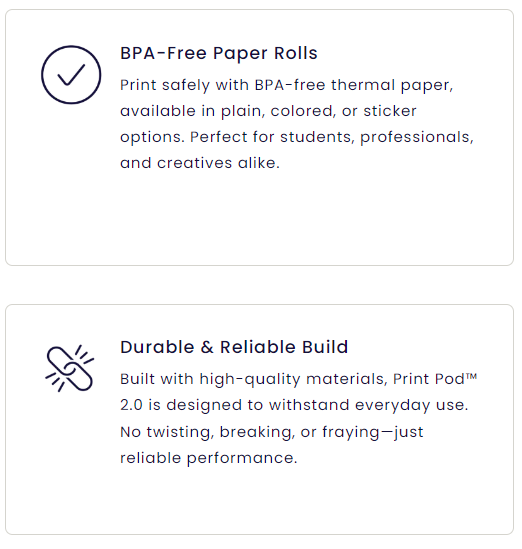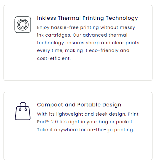 Print Anytime, Anywhere:Regardless of your role, our mini printer will be an essential tool for expressing your ideas. Whether you're a student looking to condense important lecture notes, a professional in need of a quick meeting memo, a parent wanting to create fun educational stickers for your kids, or an artist seeking to capture a sudden burst of creativity, our Print Pod™ 2.0 is always available to assist you. With adhesive backing on every printout, you can easily stick your ideas anywhere, anytime.